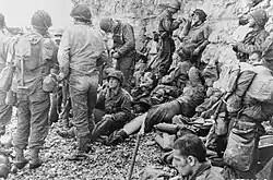 On the 116th RCT front, the remainder of the 1st Battalion, B/116, C/116 and D/116, were due to land in support of A/116 at Dog Green. Three boats, including their headquarters and beach-master groups, landed too far west, under the cliffs. Their exact casualties in getting across the beach are unknown, but the one-third to one-half that made it to shore spent the rest of the day pinned down by snipers. Not all sections of the badly scattered B/116 landed there, but those that did were quickly forced to join those survivors of A/116 fighting for survival at the water's edge.[58] Two companies of 2nd Rangers, coming in later on the edge of Dog Green, did manage to reach the seawall, but at the cost of half their strength.[59]