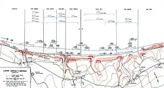 Despite these preparations, very little went according to plan. Ten landing craft were swamped by the rough seas before they reached the beach, and several others stayed afloat only because their passengers bailed water out with their helmets.[38][39] Seasickness was prevalent among the troops waiting offshore. On the 16th RCT front, the landing boats passed struggling men in life preservers and on rafts, survivors of the DD tanks which had sunk in the rough sea.[40] Navigation of the landing vehicles was made difficult by the smoke and mist obscuring the landmarks they were to use in guiding themselves in, while a strong current pushed them continually eastward.[41]