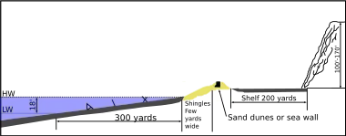 Omaha was bounded at either end by large rocky cliffs. The crescent-shaped beach presented a gently sloping tidal area averaging 300 m (330 yd) between low and high-water marks. Above the tide line was a bank of shingle 2.5 m (8 ft) high and up to 15 m (49 ft) wide in places. At the western end, the shingle bank rested against a stone (further east becoming wood) sea wall which ranged from 1.5–4 m (5–13 ft) in height. For the remaining two thirds of the beach after the seawall ended, the shingle lay against a low sand embankment. Behind the sand embankment and sea wall was a level shelf of sand, narrow at either end and extending up to 200 m (220 yd) inland in the center, and behind that rose steep escarpments or bluffs 30–50 m (33–55 yd) high, which dominated the whole beach and were cut into by small wooded valleys or draws at five points along the beach, codenamed west to east D-1, D-3, E-1, E-3 and F-1.[4]