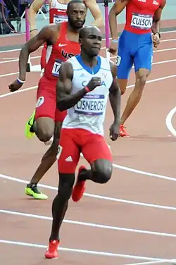 He decided to focus solely on the 400 m flat in 2008 and dipped under 46 seconds (45.98) to take the bronze medal at the 2008 Central American and Caribbean Championships.[3] A team comprising William Collazo, Yunier Pérez, Cisneros and Yeimer López also won the relay gold medal and their time of 3:02.10 minutes meant the team had achieved the Olympic qualifying time.[4] Cisneros won another gold with the relay team at the 2008 Ibero-American Championships in Athletics and went on to make his Olympic debut at the age of eighteen at the 2008 Beijing Games, where he ran a split of 44.36 seconds in the heats.[5]