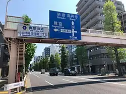 The Chuō, Saikyō, Shōnan-Shinjuku, and Yamanote train lines pass over the highway, with 10 lanes of roadway and sidewalks beneath.[3]