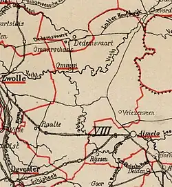 The electoral district of Ommen was created in 1888 out of parts of the districts of Zwolle, Almelo and Deventer, which were reduced from two seats to one each. Ommen's boundaries remained the same throughout the electoral district's existence. Situated in the centre of the province of Overijssel, it included the municipalities of Gramsbergen, Den Ham, Hardenberg, Hellendoorn, Holten, Ommen, Raalte and Vriezenveen. The district was predominantly agricultural.[1][2]
