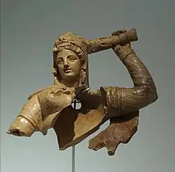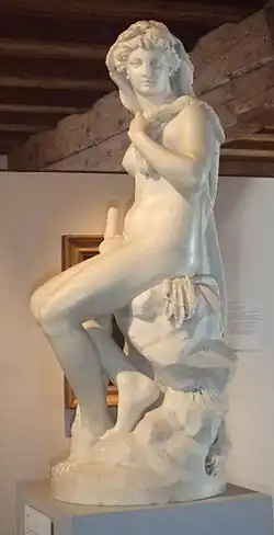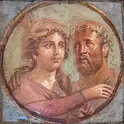 In Greek mythology, Omphale (/ˈɒmfəˌliː/; Ancient Greek: Ὀμφάλη, romanized: Omphale, lit. 'navel') was princess of the kingdom of Lydia in Asia Minor. Diodorus Siculus provides the first appearance of the Omphale theme in literature, though Aeschylus was aware of the episode.[1] The Greeks did not recognize her as a goddess: the undisputed etymological connection with omphalos, the world-navel, has never been made clear.[2] In her best-known myth, she is the mistress of the hero Heracles during a year of required servitude, a scenario that, according to some,[3] offered writers and artists opportunities to explore sexual roles and erotic themes.