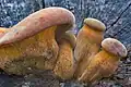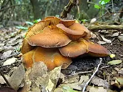 Omphalotus is a genus of basidiomycete mushroom, in the family Omphalotaceae, formally circumscribed by Victor Fayod in 1889. Members have the traditional cap and stem structure. They are saprobic, and fruit in clumps on the ground, adjacent to host trees. The best known and type species is the jack-o'-lantern mushroom (Omphalotus olearius). Species of Omphalotus have been mistaken for chanterelles. All Omphalotus species are presumed poisonous, causing gastrointestinal symptoms. Some Omphalotus species have bioluminescent properties.[3]