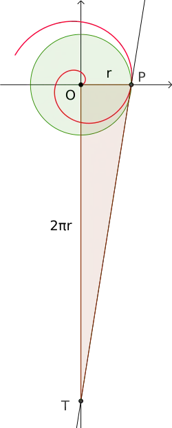 Let P be the point on the spiral when it has completed one turn. Let the tangent at P cut the line perpendicular to OP at T. OT is the length of the circumference of the circle with radius OP.