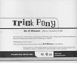"On a Mission" is a song recorded by American country music group Trick Pony. The song was written by member Ira Dean along with David Lee Murphy, and Kim Tribble and produced by Chuck Howard. It was released on August 26, 2002 as the lead single from the group's second studio album On a Mission (2002).