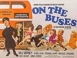 On the Buses is a 1971 British comedy film directed by Harry Booth and starring Reg Varney, Doris Hare, Michael Robbins, Anna Karen, Stephen Lewis and Bob Grant.[6] It was the first spin-off film from the TV sitcom On the Buses and was followed by two further films, Mutiny on the Buses (1972) and Holiday on the Buses (1973). The film was produced by Ronald Chesney and Ronald Wolfe for Hammer Films.[7]