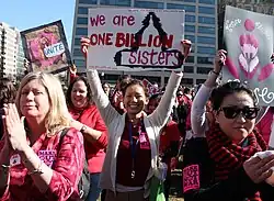 One Billion Rising is a global campaign, founded by Eve Ensler, to end rape and sexual violence against women.[1][2][3] It was started in 2012 as part of the V-Day movement. The "billion" refers to the UN statistic that one in three women will be raped or beaten in her lifetime,[4] or about one billion. The campaign expands each year with new themes and artistic actions. In 2024, the theme of the campaign is Rise for Freedom.[5] "This year's campaign will escalate the collective actions of activists worldwide, and amplify their call for systematic changes towards ending violence against women and children once and for all," said OBR global director Monique Wilson.[6]