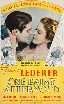 One Rainy Afternoon is a 1936 American romantic comedy film directed by Rowland V. Lee, starring Francis Lederer and Ida Lupino, and featuring Hugh Herbert, Roland Young, and Erik Rhodes. It also marked the last film appearance by actress Florence Lawrence, who died in 1938, who had an uncredited bit role in the film. It was written by Stephen Morehouse Avery, with additional dialogue by Maurice Hanline, from the screenplay for the 1935 French film Monsieur Sans-Gêne by Emeric Pressburger and René Pujol, which was based on the story "The Satyr" by Pressburger.[1][2] The film was reissued in 1948 as Matinee Scandal.