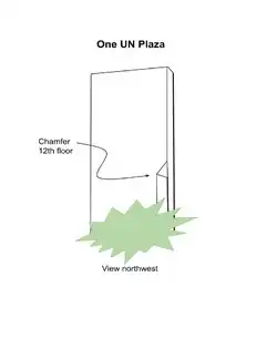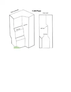 Also, it is no coincidence that the slant-out occurs at exactly the same height as the Church Center for the UN: the 12-story building directly across the street on 44th Street.[7] Roche's attention to the building's surroundings rationalized the logical aesthetic look to "deflect one's attention across 44th Street and to the visual panoply of the UN" as one drives north up the UN Plaza street or walks south (note: UN Plaza is a one-way street, running only northbound, as First Avenue was diverted underground and parallels the UN Plaza street to reduce traffic).[7] The building is skirted by a second-story facade that slopes outward, thus creating a canopy above the ground floor. By accommodating the specific zoning laws of New York City, the result became an instant success.[7] "Svelte of build and spiffily draped in a toga of reflective blue-green glass, the 39-story One United Nations Plaza ... is a friendly neighborhood skyscraper which, leaving a lot to the imagination, has a lot going on inside its 586,000-square-foot bulk," according to William Marlin. The Roche-Dinkeloo architects designed One as an architectural complement to the UN Secretariat Building, situated diagonally across the street on First Avenue of the typical "postmodernist" design.[7] It is basically the same height as the UN Secretariat — minus three feet. One's 505 ft (154 m) height could not be taller according to New York City's zoning laws. Therefore, visually and architecturally it was designed with the same visual enthusiasm as the Secretariat Building and became an aesthetic complement to rival the equally-impressive UN headquarters. With its glass and aluminum facade similar to its grand neighbor, albeit with some differences discussed below, One UN Plaza became hugely popular. "[The building] is an intelligent counterpoint to the U.N.'s Secretariat Building — the color ... the materials, and the odd shape ... provides an interesting rhythm to play against the Secretariat's even slab." Silver states regarding the setbacks: "KRJDA's intentions are beyond the merely anecdotal. This is revealed in other interesting aspects. The glass and metal wall is folded like paper, forming a few angular prisms horizontally and vertically on the exterior and making it geometrically different from anything nearby in the cityscape."[13]