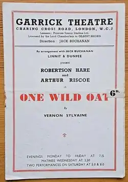 One Wild Oat is a comedy play by the British writer Vernon Sylvaine which premiered in 1948. Its West End run was at the Garrick Theatre with direction by the veteran entertainer Jack Buchanan. It ran for 508 performances from December 1948 to February 1950.[1] The cast originally included Robertson Hare and Alfred Drayton, who had appeared together in several of Sylvaine's farces and their subsequent film adaptations. In 1949, following the death of Drayton, his role was taken over first by Arthur Riscoe and then Hartley Power.