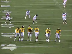 Traditionally, the onside kick had its own formation, in which the other ten players of the kicking team would line up on one side (left or right) of the kicker, in an effort to get as many people as possible into one area of the field. This is still popular in high school football; however, the NCAA (and later the NFL) now require that at least four players line up on each side of the kicker. To combat this, some teams (including the Buffalo Bills, who pioneered this strategy[3]) developed a "cluster formation" in which all of the players line up behind and immediately next to the kicker in what is effectively a moving huddle. The NFL eventually banned this, too, with a 2009 rule change that states that "the kicking team cannot have more than five players bunched together"; the rule change has been considered a gratuitous targeting of Bills special teams coach Bobby April, as the ostensible reason for the ban (injury risk) had negligible evidence to support it.[3] Effective with the 2018 season, the NFL requires that the kicking team line up with five players on each side of the ball. Additionally, the kicking team's players must line up in a specified configuration—on each side of the ball, at least two players must be between the sideline and the numbered yard markings, and at least two must line up between the numbers and hashmarks. At the same time, the NFL also required that at least eight members of the receiving team line up within the 15-yard "setup zone" (between 10 and 25 yards from the kickoff spot).[4]