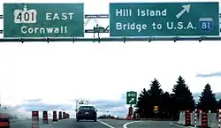 King's Highway 137, commonly referred to as Highway 137, is a provincially maintained highway in the Canadian province of Ontario that connects the northern end of Interstate 81 in the U.S. state of New York with Highway 401 via the Canadian span of the Thousand Islands Bridge. While this road connected to the international bridge when it opened in August 1938, it was not designated as a King's Highway until 1965. Highway 137 passes through a portion of the Canadian Shield, a geographic feature which aided construction of the three Canadian spans of the Thousand Islands Bridge. These bridges, all of different designs, travel 538 m (1,765 ft) across the Saint Lawrence River. Highway 137 is 4.3 km (2.7 mi) in length and is located entirely within the United Counties of Leeds and Grenville.