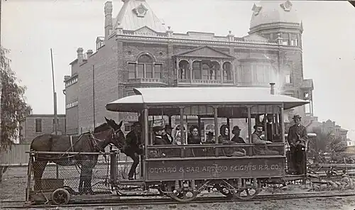 The mule-car served Ontario until 1895, when the line was electrified by new owners, Ontario Electric Company.[1][2][3] It was occasionally used afterwards, when the electric generator in the powerhouse was flooded.[4] The Ontario Electric Company was merged into the Pacific Light & Power Corporation in 1908, and the extension to Pomona commenced work in 1909, which opened New Year's Day 1911.[5] The railroad would go on to be acquired by the Pacific Electric on April 13, 1912.[3][6]
