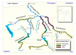 The Ontonagon River (/ˌɒntəˈnɑːɡən/ ON-tə-NAH-gən) is a river flowing into Lake Superior at the village of Ontonagon, on the western Upper Peninsula of Michigan in the United States. The main stem of the river is 25 miles (40 km) long[4] and is formed by a confluence of several longer branches, portions of which have been collectively designated as a National Wild and Scenic River.[5] Several waterfalls occur on the river including Agate Falls and Bond Falls.