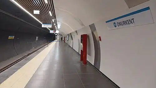 Onurkent is an underground rapid transit station on the M3 line of the Istanbul Metro.[2] It is located on Mimar Kemalettin Boulevard in Başakşehir. It was opened on 8 April 2023 with the Onurkent-Kayaşehir Merkez expansion built by the Ministry of Transport and Infrastructure.[3]