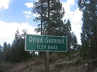 Onyx Summit is a mountain pass located in the San Bernardino Mountains in the southwestern part of San Bernardino County, California, United States. At an elevation of 8,443 ft. (2,573 m), it is the highest mountain pass in Southern California. California State Route 38 traverses it at postmile 39.37 in the eastern part of San Bernardino National Forest.
