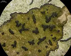 The ascomata (spore-producing structures) are dispersed relatively evenly across the thallus, though sometimes they appear in clusters of two to four. These structures are lirelliform (slit-like) in shape, generally straight, but can also have curved or slightly flexuous patterns. They are black and measure between 0.2 and 1.2 mm in length and 0.15–0.3 mm in width. Their hymenial disc is not pruinose and looks like a distinct slit.[4]