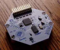 The OpenBCI 32-bit board uses the ADS1299, an IC developed by Texas Instruments for biopotential measurements.[5] The OpenBCI uses a microcontroller for on-board processing — the 8bit version (now deprecated) uses an Arduino-compatible ATmega328P IC, while the 32bit board uses a PIC microcontroller — and can write the EEG data to an SD card, or transmit it to software on a computer over a bluetooth link.