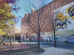 The eastern part of the property was developed as Public School 60, presently East Side Community High School; and Mary Help of Christians Church, which stood until 2013.[8][9] The rest was developed as a garage for public buses. When the garage was demolished in 1987, it left a contaminated vacant lot that was sought by Open Road as a potential park. In 1993, with funding from the city Department of Sanitation, the nonprofit had the lot covered with a liner which was then covered with gravel, soil and compost in advance of its development as a garden.[10] Two years later, a greenhouse and turtle pond were constructed with the assistance of local high school students.[11] The pond receives some of its water though a bioswale design that collects rainwater throughout the garden. The northern two-thirds of the site was developed as a playground. With the support of Trust for Public Land, the site was purchased to save it from development.