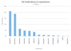 As of April 2025, the UK-based Directory of Open Access Repositories lists 152 repositories in Poland.[3] However, according to the OpenAIRE project, "the majority of these are digital libraries, providing access to the digitized content of library collections, not functioning as repositories open to authors for the deposition of their own work."[2] University of Lodz Repository and Adam Mickiewicz University Repository maintain the largest number of digital assets.[2] The Warsaw Public Library runs the Mazowiecka Biblioteka Cyfrowa digital library, established in 2011.