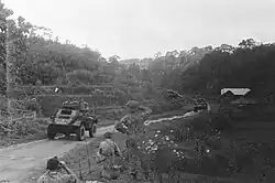 Dutch paratroopers from Korps Speciale Troepen[12][13] landed at Maguwo airfield, which was defended by 47 lightly armed Indonesian Air Force cadets who lacked anti-aircraft machine guns. In advance, dummies were landed by the Dutch to draw enemy fire which enabled Dutch fighter planes to strafe the defenders.[1] The skirmish lasted for 25 minutes ending with the Dutch taking over Maguwo; killing 128 republicans with no casualties.[14] Having secured the airfield perimeter by 06:45, the Dutch were able to land airborne troops in two successive waves and use Maguwo as an airhead for reinforcements from their main base in Semarang.[1] At 8:30 am, General Spoor gave a radio broadcast ordering his forces to cross the Van Mook line and capture Yogyakarta to "purge" the republic of "unreliable elements".[1]