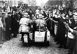 Professor Jozo Tomasevich and others divide the invasion and resultant fighting into two phases.[80] The first phase encompasses the Luftwaffe's devastating air assault on Belgrade and airfields of the Royal Yugoslav Air Force of 6 April, and an initial thrust of the German XL Panzer Corps from Bulgaria towards Skopje that commenced the same day.[81] This was followed by the assault of the German XIV Panzer Corps from Bulgaria towards Niš on 8 April.[82] On 10 April, four more thrusts struck the Yugoslav Army; the XLI Panzer Corps from Romania towards Belgrade, the XLVI Panzer Corps from Hungary across the Drava,[83] the LI Infantry Corps from Austria towards Zagreb,[84] and the XLIX Mountain Corps from Austria towards Celje.[85] By the end of that day, the Yugoslav Army was disintegrating, and was in retreat or surrendering right across the country, with the exception of the forces on the Albanian frontier.[80] Italy and Hungary joined the ground offensive on 11 April. The Italian part in the ground offensive began when their 2nd Army attacked from northeastern Italy towards Ljubljana and down the Dalmatian coast, meeting virtually no resistance. On the same day, the Hungarian 3rd Army crossed the Yugoslav border and advanced toward Novi Sad, but like the Italians, they met no serious resistance. On 12 April, German troops captured Belgrade,[86] and Ljubljana fell to the Italians.[87] On 14 and 15 April, King Peter and the government flew out of the country,[88] and the Yugoslav Supreme Command was captured by the Germans near Sarajevo.[89] The surrender was signed on 17 April and came into effect at noon on 18 April.[90]