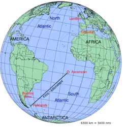 During the early 1980s, British defence planning was focused on the Cold War confrontation with the Soviet Union. Nonetheless, at six-monthly intervals the Defence chiefs reviewed other possible areas of conflict around the globe, including the Falkland Islands. The consensus was that they were indefensible.[1] The nearest airfield usable for operations was on Ascension Island, a British territory in the South Atlantic not far from the equator with a single 10,000-foot (3,000 m) runway at Wideawake airfield that lay 3,700 nautical miles (4,300 mi; 6,900 km) from the UK and 3,300 nautical miles (3,800 mi; 6,100 km) from the Falklands.[2][3] Without aircraft able to cover the long distance, the Royal Air Force (RAF) could not envisage carrying out operations in the South Atlantic. Activities in the South Atlantic would be carried out by the Royal Navy and the British Army, with the RAF's role restricted to the Hawker Siddeley Nimrod maritime patrol aircraft and logistic support of the base at Ascension by Vickers VC10 and Lockheed C-130 Hercules transport aircraft.[1][4]