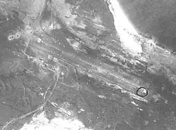 Aerial reconnaissance photo of Port Stanley Airport. The craters from Black Buck One's bombs are visible in the middle. Black Buck Two's craters are visible more clearly to the left.