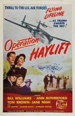 Operation Haylift is a 1950 American aviation film by William Berke starring Bill Williams, Ann Rutherford, and Tom Brown. The film—a fictionalized account of a true story—documents the United States Air Force mission in 1948–49 to save thousands of cattle caught in the snowdrifts of a sudden winter storm in northern Nevada. "Operation Haylift" involved scores of cargo aircraft delivering hay to the stranded animals.[1]