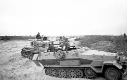 East of the River Orne, the 125th Panzergrenadier Regiment headed towards the captured bridges. The column was quickly spotted and engaged for the next two hours by Allied artillery and aircraft causing heavy losses.[18] At 16:00, to the west of the Caen canal, 1st Battalion, 192nd Panzergrenadier Regiment and the 100th Panzer Regiment successfully reached the coast between the British Sword and the Canadian Juno.[19] Here they linked up with the 736th Infantry Regiment, which had been defending Lion sur Mer.[20] The German units gathered their strength on the beaches and waited for further orders from divisional commander Generalmajor Edgar Feuchtinger.[20]