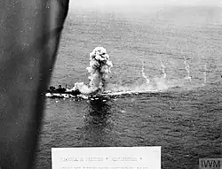 Fliegerführer Atlantik promised aircraft but Marinegruppe West could offer no ships until the next morning.[32] The light cruiser Enterprise to the east of Alsterufer and Glasgow 300 nmi (560 km; 350 mi) to the west, were ordered to make their best speed to a point 300 nmi (560 km; 350 mi) north-west of Cape Finisterre.[29] At 4:07 p.m. Liberator GR Mk V "H" of 311 (Czech) Squadron, sighted Alsterufer.[33][g] The Liberator made a diving attack through the anti-aircraft fire of Alsterufer and fired its eight wing-mounted, semi-armour piercing (SAP60) rocket projectiles. Five of the rockets hit the ship above the waterline and a 500 lb (230 kg) bomb and a 250 lb (110 kg) bomb hitting the ship aft of the funnel, killing two sailors and setting the ship on fire.[33] Alsterufer had opened fire with anti-aircraft guns and parachute-and-cable rockets, hitting the Liberator's starboard outer engine but the aircraft returned to base at RAF Beaulieu in England. Four hours later, two Liberators of 86 Squadron finished off the ship. Alsterufer sank on the afternoon of 28 December. Four lifeboats with 74 survivors were picked up two days later by four Canadian corvettes.[34][h]