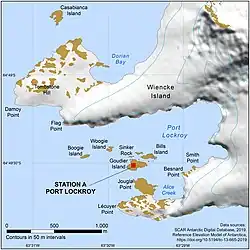 Although long-used by ships visiting the area, Port Lockroy's location restricted the range of scientific activities possible because the Gerlache Strait rarely froze, so cutting off access to the mainland. In addition, as an island location, it was inferior to Hope Bay, on the Peninsula mainland, from the perspective of strengthening British sovereignty, though this was somewhat mitigated by it being so well known. Both these factors added to the pressure Marr was under. Nevertheless, a site for the hut was chosen on Goudier Island, Base A was established, and discharging of cargo began at once.[52] Signs of Argentine territorial claims left by Primero de Mayo were removed.[53]