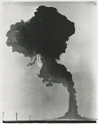 The device was detonated from a tower at 07:00 on 15 October local time (21:30 on 14 October UTC).[37] The yield was predicted to be between 0.25 and 10 kilotonnes of TNT (1.0 and 41.8 TJ), most probably in the 2 and 3 kilotonnes of TNT (8.4 and 12.6 TJ) range. In the event it was higher than forecast; Penney estimated it at 10 kilotonnes of TNT (42 TJ). The cloud rose to 4,600 metres (15,000 ft). The slight wind meant that the cloud maintained its form for 24 hours, and produced a tight fallout pattern in the immediate vicinity of the test site the like of which had not been seen before.[34][38][39]