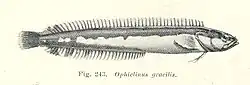 Ophiclinus gracilis, the Black-back snake-blenny, is a species of clinid native to the coastal waters of southern Australia where it prefers areas with rotting vegetation on silty substrates. It can reach a maximum length of 10 centimetres (3.9 in) TL.[2]