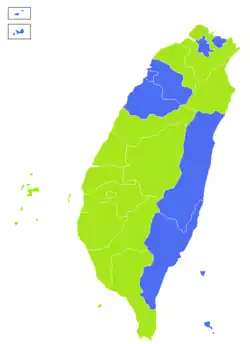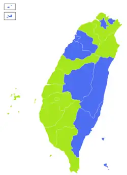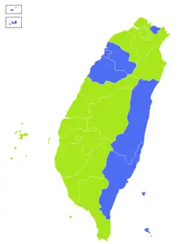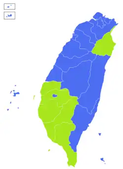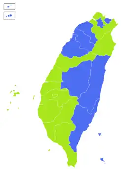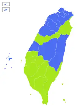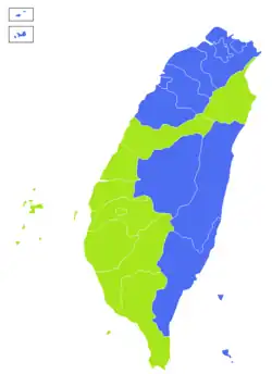| Legend | Municipalities, counties and cities where Tsai Ing-Wen is forecast to lead. Municipalities, counties and cities where Ma Ying-Jeou is forecast to lead. Municipalities, counties and cities where James Soong is forecast to lead.