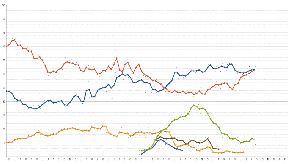 15-day average trend line of poll results from December 2011 to present, with each line corresponding to a political party.