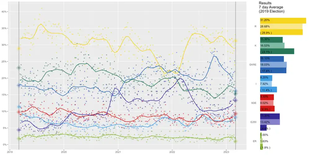 In the run up to the 2023 Estonian parliamentary election, various organisations carried out opinion polling to gauge voting intention in Estonia. The date range for these opinion polls are from the 2019 Estonian parliamentary election held on 3 March. Poll results are listed in the table below in reverse chronological order, showing the most recent first. The highest percentage figure in each poll is displayed in bold, and the background shaded in the leading party's colour. In the instance that there is a tie, then no figure is shaded.