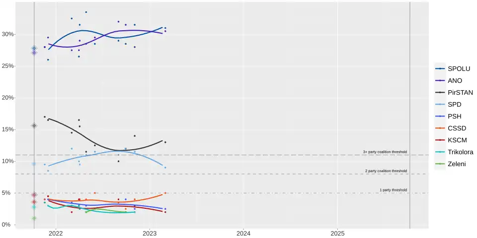 | Kantar CZ | 12–30 Sep 2022 | 997 | 28.5 | 31.5 | 12.0 | 12.0 | 4.0 | 2.5 | 2.0 | – | 2.0 | – | 5.0 | 3.0 | ||||
