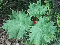 Oplopanax japonicus is a hardy frost resistant shrub. It is also the most spiny member of the ginseng family. It forms seldom and randomly branched stems that are approximately 1 m (3 ft 3 in) long. The plant is deciduous, can grow up to 3 m (9.8 ft) tall, and has bulky branches with solid yellow-orange spines. The stem is covered in spines and stocky. Petiole 3–10 cm (1.2–3.9 in), densely covered with setae. The leaf blade is approximately circular to oblate, approximately 15–30 cm (5.9–11.8 in) wide, and the two surfaces are usually 5–7 lobed. The shape of the lobes are triangular or broadly triangular, the base cordate, margins irregularly serrate, and the apex acute to slightly acuminate.[6] They have ornamental qualities but are armed with spines. Both the stem and the leaves have spines.[7]