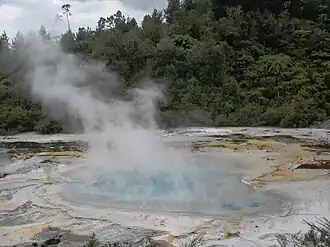 At the base of the two lower terraces – named Rainbow and Cascade Terraces – are several small geysers, including the intermittently active Sapphire Geyser, and the Hochstetter Pool (named after Austrian pioneer geologist Ferdinand von Hochstetter, who visited the area in 1859), which erupted in November 1954 and played as a geyser until mid-1955, ceasing suddenly after swarms of subterranean earthquakes.