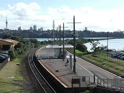 The site, 2 mi 5 ch (3.3 km) from the new Auckland station and 7 mi 55 ch (12.4 km) from Westfield, was levelled in 1925, requiring 300,000 cart loads to be removed. J W Bambury Ltd built the flag station of wood, with a tiled roof. In 1953 2 railway houses were built. The station burnt down on 27 May 1972,[3] leaving only parts of the walls and verandah.[4] It was replaced by a temporary shed. By 1989 it had a concrete block shelter shed and a platform 164 m (538 ft) long and 250 mm (9.8 in) high 250 mm.[5]