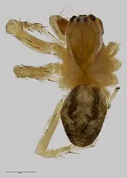The male is recorded at 4.4mm in length. The cephalothorax is yellowish brown with dark markings dorsally. The legs are pale with some dark bands. The abdomen has a variety of complex dark markings.[2]