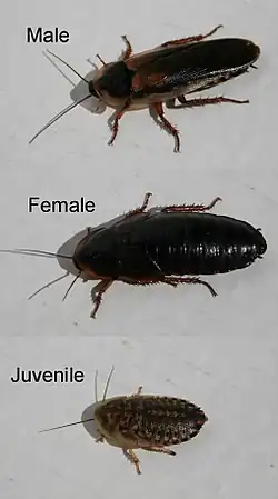 They are sexually dimorphic; adult males have full wings covering their body, while females have only tiny wing stubs - their tegmina (forewings) being around a fourth of their body length.[6][8] Adults are dark brown to black with somewhat lighter orange spot/stripe patterning sometimes visible only in bright light. Coloration differs slightly with environment and diet from one colony to another.