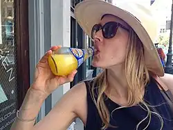 Orangina (French pronunciation: [ɔʁɑ̃ʒina]) is a lightly carbonated beverage made from carbonated water, 12% citrus juice (10% from concentrated orange, 2% from a combination of concentrated lemon, concentrated mandarin, and concentrated grapefruit juices), as well as 2% orange pulp.[1][2] Orangina is sweetened with sugar or high fructose corn syrup (glucose fructose) and in some markets (such as the United Kingdom) with artificial sweetener. Natural flavours are also added.[3]