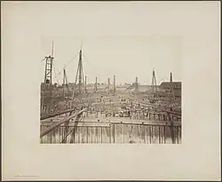 On 11 May 1868 the pit for the foundations was made dry. That month 3,000 m3 of ground was removed from the pit.[26] In June another 3,500 m3 of ground was removed, and part of the digging reached a level of 6 m below AOD. In July another 10,500 m3 was removed. On 19 July the first pile for the locks was driven into the ground.[27]