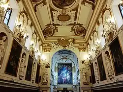 Interior of the oratory. Stucco decoration is by Giacomo Serpotta. Main altarpiece Madonna of the Rosary with saints (1627) by Anton van Dyck.
