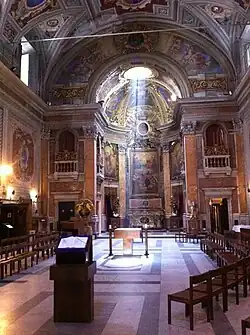 Also conserved are the seventeenth-century frescoes depicting the Life of Saint Francis Xavier, located in the atrium and executed by various artists on a design by Lazzaro Baldi (1624-1703),[5] while the main altarpiece dating from the eighteenth century is by Sebastiano Conca and depicts the Holy Trinity and Saint Francis Xavier.[11][12][13]