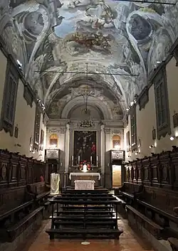 The main altar has a fresco (1610) by Francesco Curradi, with flanking canvases by Giovanni Antonio Sogliani depict the Visitation. Previously a Crucifixion with Saints Nicola and Francis (circa 1430) painted by Fra Angelico stood here, but now in sacristy. Other frescoes are by Pieter de Witte and Giuseppe Servolini. The ceiling is frescoed with theLife of St Niccolò (1734) by Giovanni Domenico Ferretti.[2]