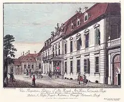 The Kingdom of Prussia took over the building in 1811, upon the dissolution of the Order by a government desperate for funds in the midst of the Napoleonic Wars, and the building thereafter housed several governmental agencies before Prince Charles of Prussia made it his residence[1] in 1829. He had the palace remodeled in a Neoclassical style according to plans by Karl Friedrich Schinkel, with an annex built by Friedrich August Stüler. In 1853, the building, now numbered Wilhelmplatz No. 8/9, saw the solemn restoration of the Johanniterorden and Prince Charles's installation as the new Herrenmeister. After his death in 1883, the palace remained the residence of Prince Charles's descendants Princes Frederick Charles and Friedrich Leopold of Prussia.